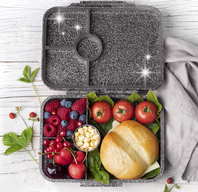 Diese wunderschöne Glitzerbox inspiriert und animiert dich dazu, jeden Tag köstliche Mahlzeiten für dich oder deine Kinder zuzubereiten. Das größte Fach der Glamour Brotbox ist ideal für Butterbrot, belegte Brötchen oder Wraps. Du kannst darin aber auch Salat, Nudeln oder Auflauf für die Arbeit transportieren. Die zwei kleinen Fächer bieten Platz für Obst, Gemüse, Snacks und Beilagen.